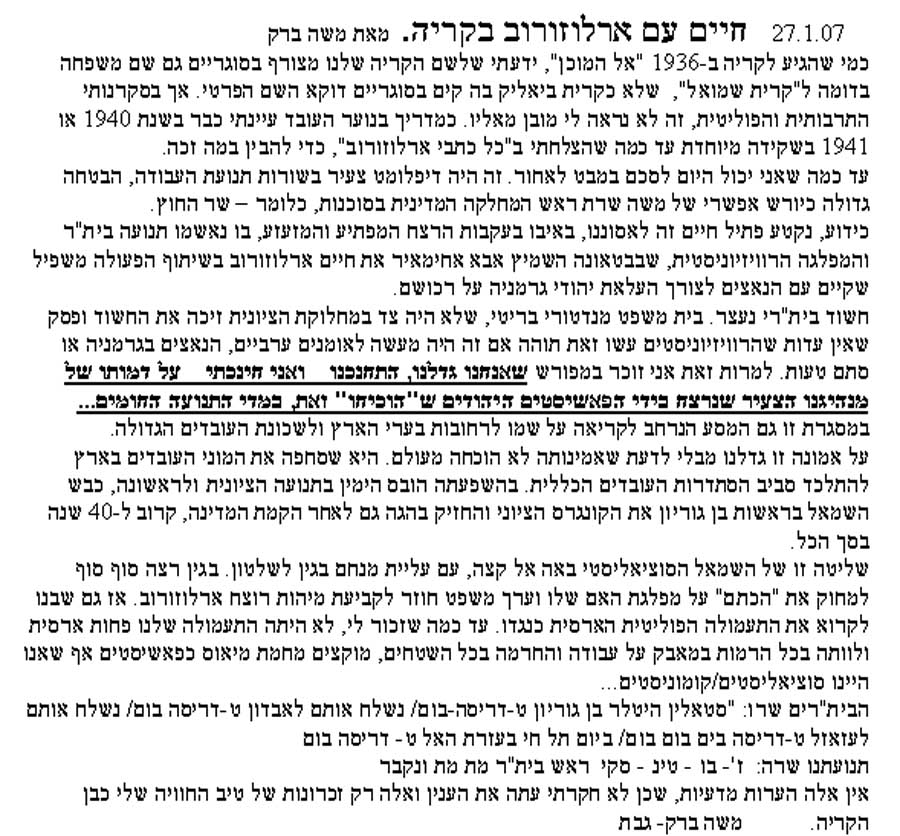 < "משה ברק כותב : "חיים עם ארלוזורוב בקריה