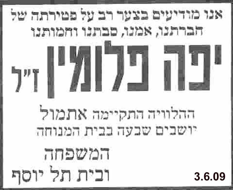 3.6.09 יפה פלומין מקיבוץ תל יוסף הלכה לעולמה-יהי זכרה ברוך : יפה היא אימו של רמי