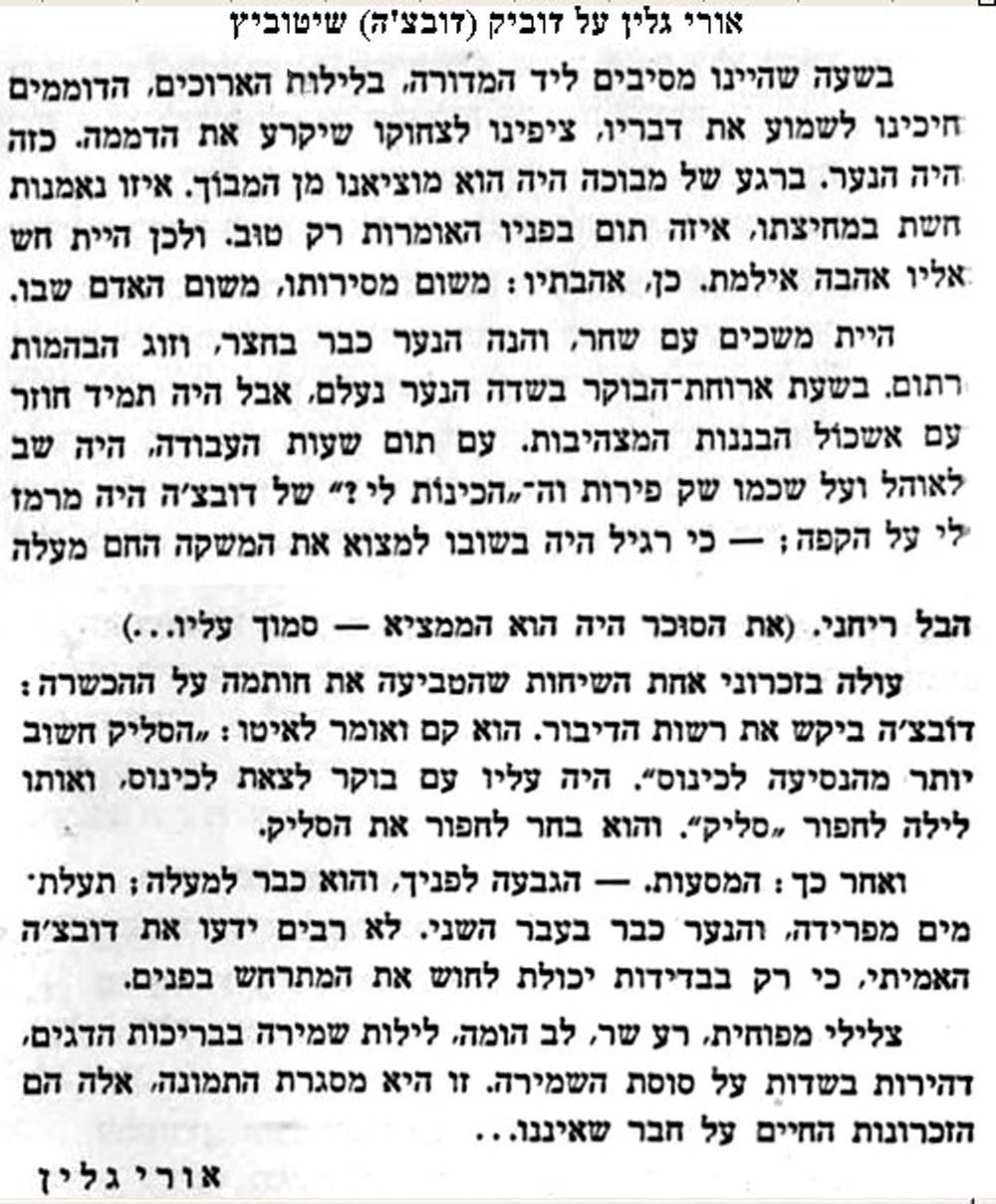 דוביק, יחד היו במחלקת הפלמ"ח בדגניה ב',כשאחי דוביק נפל בקרב, כתב אורי מכתב