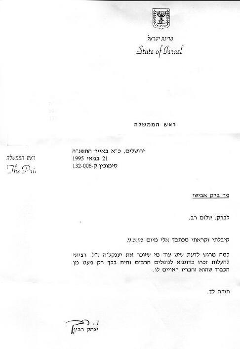 לאחר יום הזכרון כתבתי מכתב לראש הממשלה יצחק רבין, ובו כתבתי