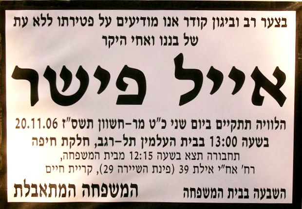 פישר ובני המשפחה איתכם באבלכם, על מות אייל , לפתיחה >>